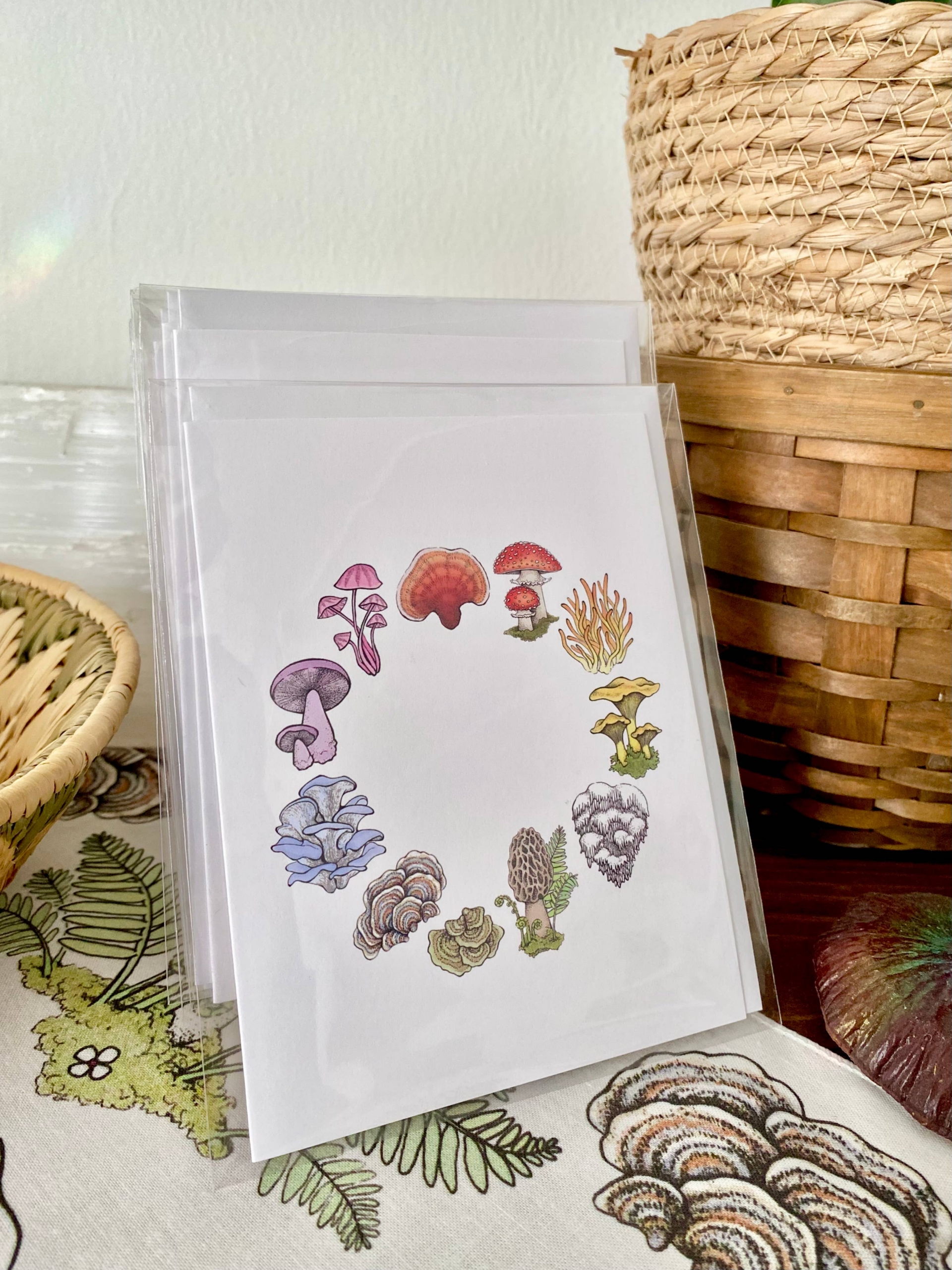 Blank greeting card featuring a rainbow of mushrooms.