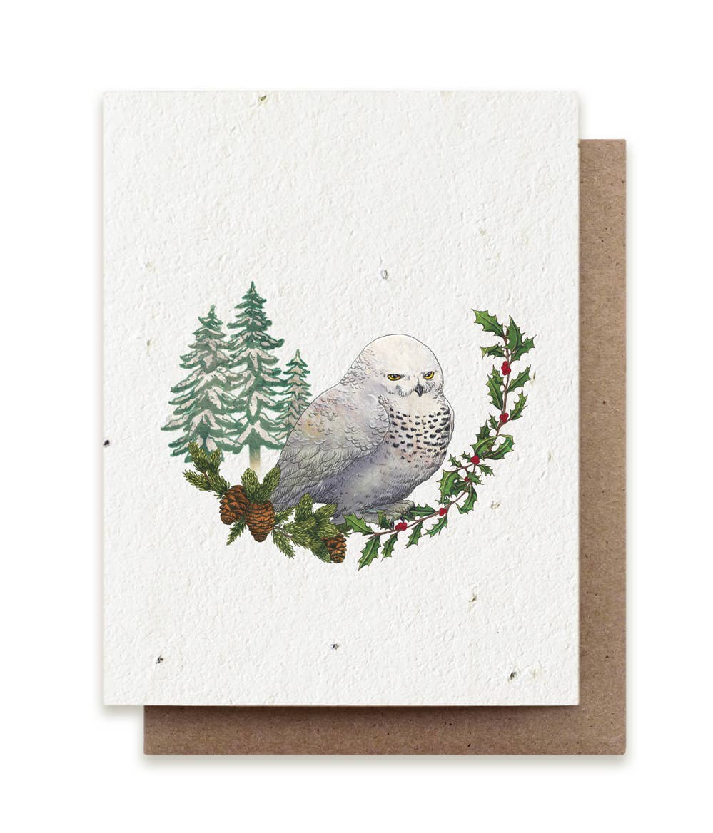 These greeting cards feature our original illustration of a snowy owl with holly and spruce branches. They are printed on white seeded paper made from post-consumer waste. Embedded in this plantable paper is a mix of herb seeds: parsley, chive, and basil.